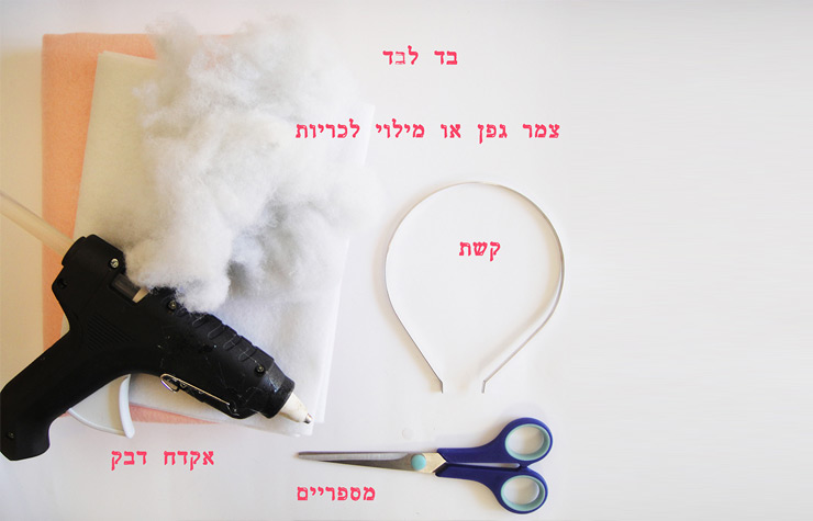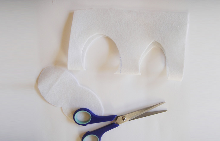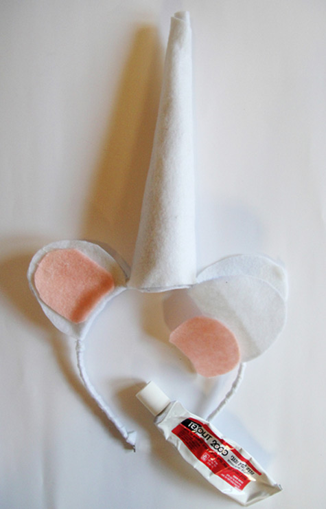 - האוזניים: גזרו שתי אליפסות על בד לבד לבן מקופל לחצי , כך שתתקבל אוזן כפולה. מקמו את האוזניים על גבי הקשת (משני צדי הקונוס) והדביקו אותן לקשת.
