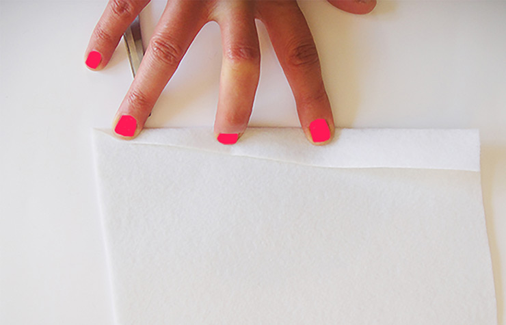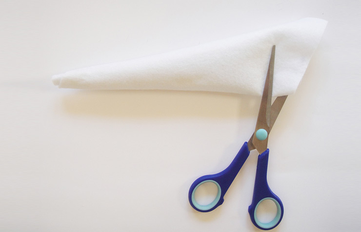 - הכנת הקונוס: פרסו חתיכת בד לבד לבן בגודל 19*25 ס"מ, תפסו קצה אחד והתחילו לגלגל את היריעה לקונוס. הדביקו את השוליים של המשולש